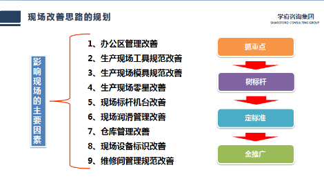 在总结前段工作的基础上,咨询老师提出了下步改善计划。自办公区管理改善、生产现场工具规范改善、生产现场模具规范改善、生产现场零星改善、现场标杆机台改善、现场润滑管理改善、仓库管理改善、现场设备标识改善、维修间管理规范改善 9个方面进行布置。